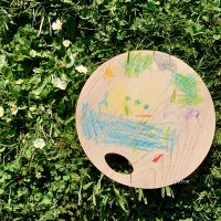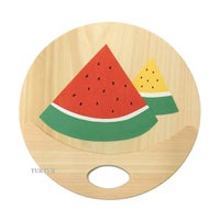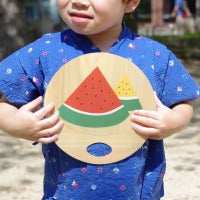 画材は何でもOK!水性ペン・油性ペン・ポスカ・ポンキー・クレヨン・色鉛筆など、お好みのものをお使いください。ペンやポスカは、木目に沿って少しにじみますが、ポスカは特に発色がきれいないので、おすすめです。(下の3枚目の写真のあさがおはポンキー、波はポスカ、スイカは色画用紙を貼って作っています。)