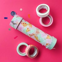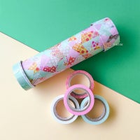 3枚の鏡と紙筒でかんたんに作れる万華鏡。キットにはマスキングテープと万華鏡の中身のパーツとしてセロファンやモール、おはじき、花のスパンコールが付いています。