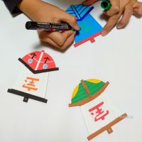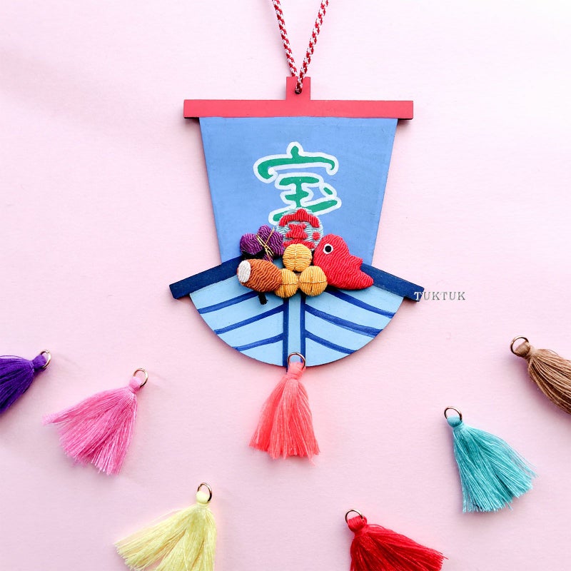 新年のイベントにぴったりなおみくじがセットになった宝船のキット。好きなデザインで宝船に色を塗って、宝物とミニタッセルを付ければ、めでたい宝船の出来上がり。ミニタッセルはアソートです。紅白のひもを通して飾ってね。