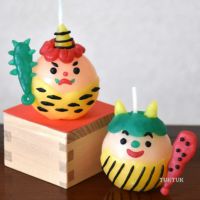 黄色のシートを伸ばすようにキャンドルに貼り付けていき、服を作ります。ツノは1本の場合は芯に巻き付けて作ると、バランスよくなります。黒のシートで、服とツノに模様を付けます。次に、赤か緑のシートで髪の毛を作り、まゆげ・目・鼻・口などのパーツを付けていきます。残った赤か緑のシートでこん棒を作れば、完成!
