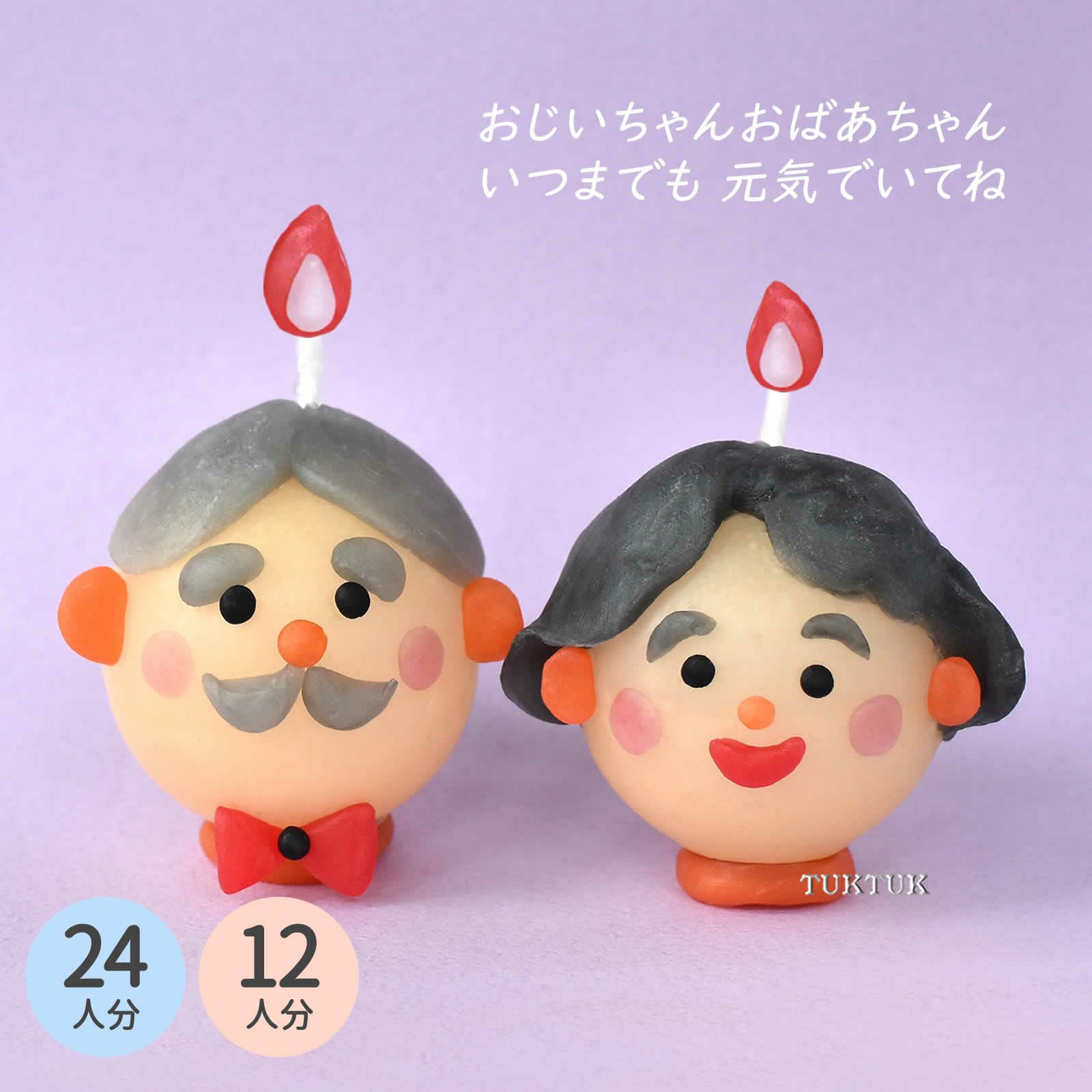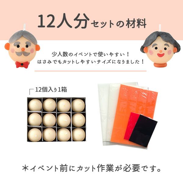 ※黒と白のカラーシートを混ぜ込んで、自分でグレーの色を作るセットになりました。髪の毛の形、お顔をどれだけ似せられるかが肝です。まず、白のシートに少しずつ黒を加えて、よくこねて、グレーの色を作ります(ひとり分の全量の白と黒を混ぜると、おばあちゃんの髪の毛の色になります)。髪の毛を作ってから、耳・まゆげ・目・鼻・口などのパーツを付けていきます。オレンジのシートでわっかを作って、キャンドルを自立させれば、完成!残ったシートで、お花やリボン、メガネなどを作ってもOKです。