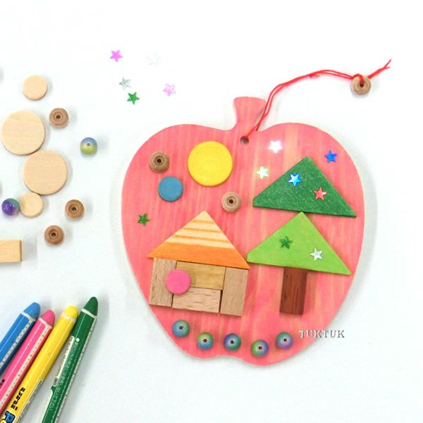 シンプルなリンゴの形のベースに、丸や三角、四角など色んな形の木切れ、ビーズ、スパンコールなどを自由に貼り付けて作る、オーナメントのキット。