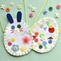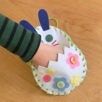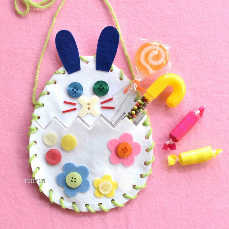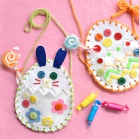 たまご型のフェルトには、最初から穴が開いているので、毛糸を通していくだけで、簡単にポシェットが作れます。フェルトシールとボタンを組み合わせて、カラフルなうさぎやたまご、好きなキャラクターに仕上げてくださいね。ギザギザしたところが口みたいにも見えるので、大きな口のたまごおばけにもなりそうです。