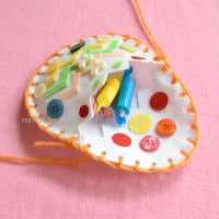 毛糸を通すのは一見難しそうですが、大丈夫です!難しく考えず、自由に通していけば、ちゃんとポシェットになります。フェルトシールも細かく切らずに、三角や四角など直線で切ってランダムに貼るだけでも、かわいく仕上がりますよ。