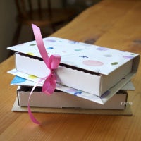 説明書に従って、内箱のパーツを抜いて組み立てます。本の表紙は、色を塗ったり、画用紙を貼ったり、包装紙でくるんだり、自由に飾り付けてください。リボンを付ける場合は、片方25cmほどの長さがあれば十分結べます。内側にはさんでも良いですし、おまけパーツを使って外側に貼り付けてもかわいいですよ。表紙が飾り付けられたら、内箱と組み合わせて、完成です!