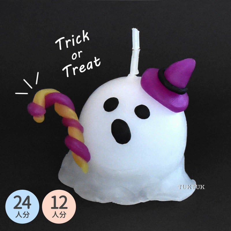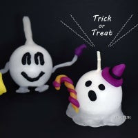 白のシートでしっぽを作って、ぎゅっとくっつけて、キャンドルが自立するようにします。両手、帽子、目や口を付ければ、トンガリ帽子をかぶったおばけの完成!黄色のシートで、星のステッキを作ったり、帽子を飾り付けたりして、かわいいおばけに仕上げてくださいね。星の形を作るのは結構難しいです。