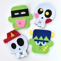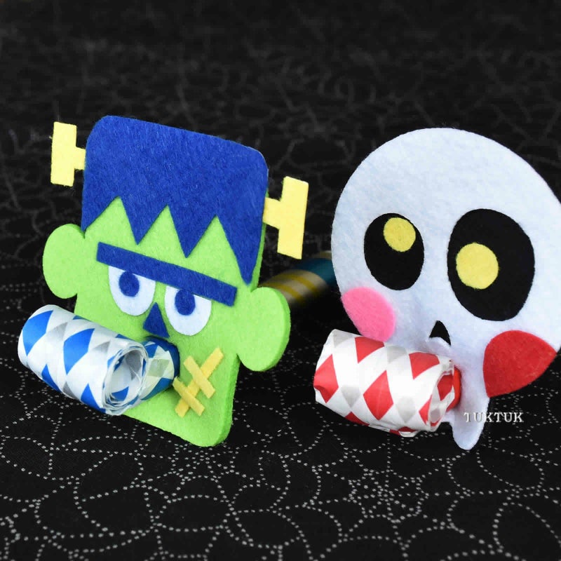 フランケンとガイコツの顔はカット済みで、吹き戻しを差し込む口も切れ込みが入っているので、顔のパーツ2枚を貼り合わせて、カラフルなフェルトシールで飾り付けるだけで、簡単に作れます。その場ですぐに遊ぶことができますよ!