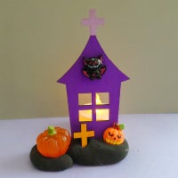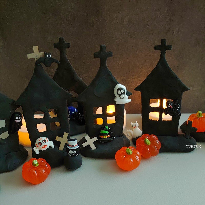 粘土をよくこねてやわらかくし、MDFハウスにうすくのばして貼り付けます。他のパーツを好きな位置にボンドで貼り付ければ完成です。ライトを点けるといい雰囲気のハロウィンの飾りになります。