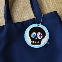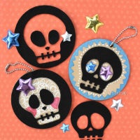 まず、フェルトガイコツのつながっている部分をはさみで切って、2つのガイコツに分けます。プレートにボールチェーンを通して、ガイコツを両面にボンドで貼ります。お好みで色を塗ったり模様を描いたりして、シールを貼れば、完成!