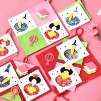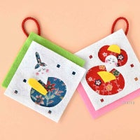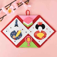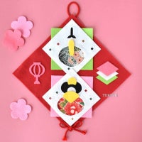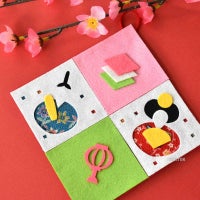 ベースとなる赤フェルトに、男雛と女雛、黄緑とピンクフェルトをどのように配置して貼るかで、全く違うデザインに仕上がります。ちりめんの貼り方を工夫したり、無地のフェルトを好きなサイズにカットしたり、自由にアレンジしてみてくださいね。お好みで、飾り付けの材料を準備していただいてもいいと思います。