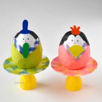 たまごに自由にマスキングテープを貼って、着物や髪の毛を作って、男雛と女雛を作ります。顔はペンで描きます。カラーシールで、笏(しゃく)・扇(おうぎ)・烏帽子(えぼし)・冠(かんむり)を切って貼ります。台座も好きな色の組み合わせで、カラフルに仕上げてくださいね。