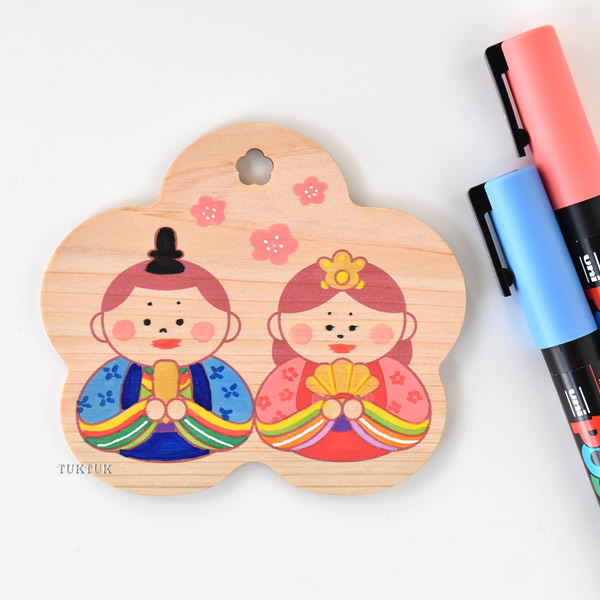 ポスカや水性ペンは、発色がきれいですが、(板の乾燥具合にもよりますが)木目に沿って結構にじみます。細かい線が多く、線と線の感覚も狭いので、ペンで塗る場合は、細字タイプのものをご用意ください。色鉛筆はにじまず塗りやすいので、おすすめです。にじませたくない目・鼻・口などポイントだけを色鉛筆で塗って、その他の着物などをペンで塗るなど、画材を使い分けてもいいと思います。