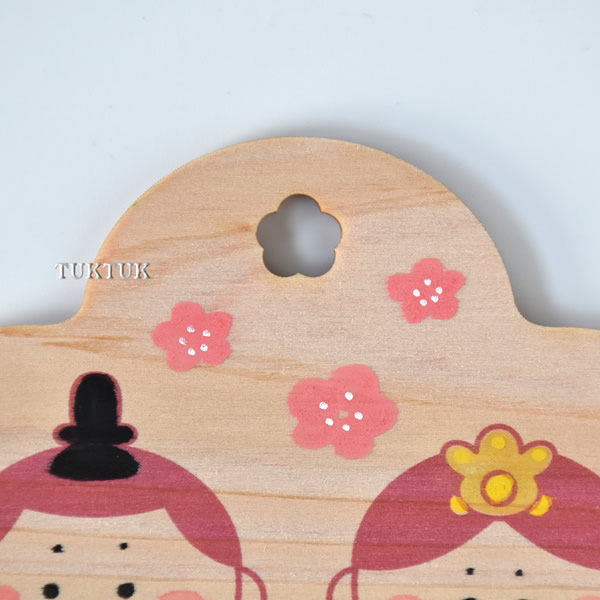 桃の花の形をした絵馬に、男雛と女雛がやさしいピンクの線画で印刷されています。よく見ると、紐穴が花の形になっているのもポイントです。