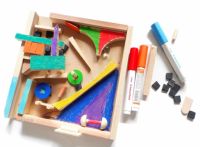 色々な形の木の端材と、正方形の箱が作れる材料が入った工作キット。全てのキットで同じ材料が入っているわけではないので、どんなものが出来るかは、内容と、作る子のセンス次第。ひとつとして同じものは完成しません。対象年齢は小学校低学年以上です。
