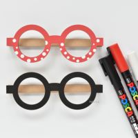ペンやポスカなどで、メガネに色を塗ります。乾いたら、他のパーツをボンドで貼り付けて完成です。