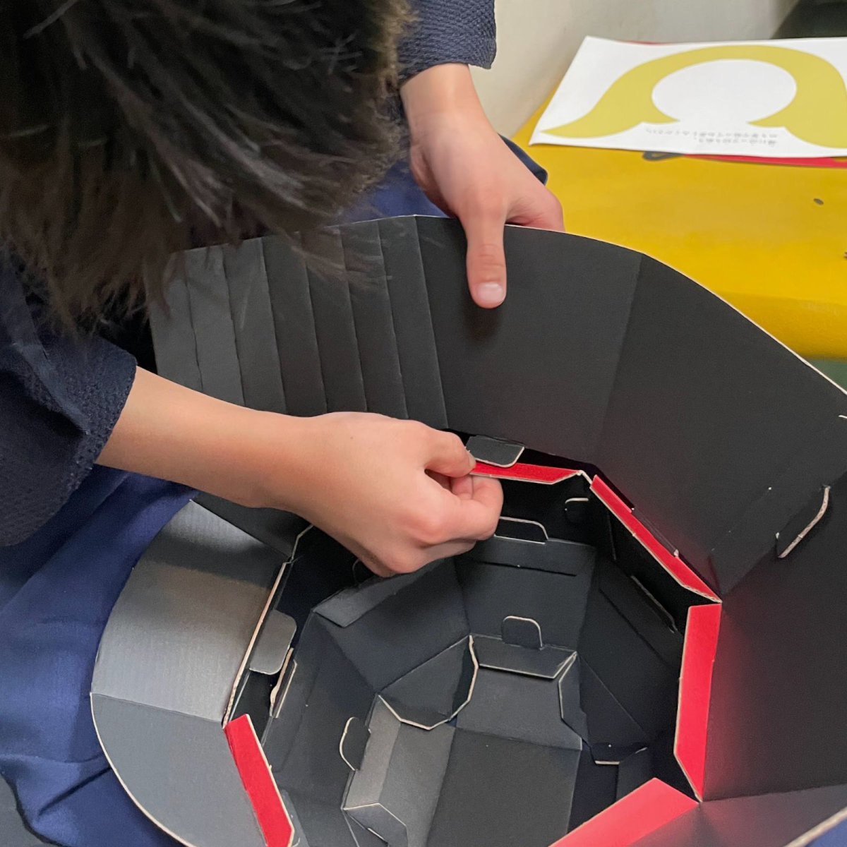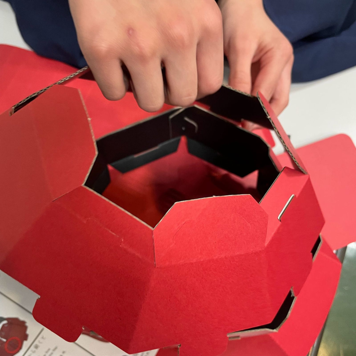 ダンボールは裏表で赤・黒のリバーシブルになっているため、パーツごとに色を変えて作ることもできます。小学校低学年、中学年でも組み立てられますが、途中、ひとりでは組み立てが難しい箇所があるので、家族やサポートのスタッフで協力しながら作ってください。