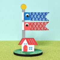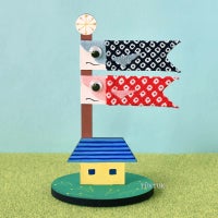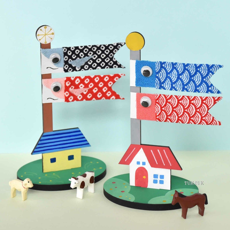 まず、土台と家に色を塗ります。次に、台紙に単色と柄物のちりめんを貼って、こいのぼりを作ります。動眼を貼って、竿の部分に2匹を並べて貼ります。家を土台の穴に差し込んだら完成です。