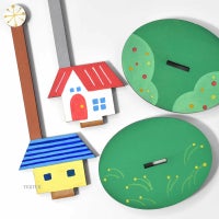 土台と家も自由に塗ってくださいね。土台は、庭をイメージして木々やお花を描いても素敵ですし、ミニチュアの人や動物と一緒に飾るのも楽しいですよ。たくさん並べるとかわいいので、イベント会場や公民館、幼稚園や学童保育などのコーナー展示にもおすすめです。