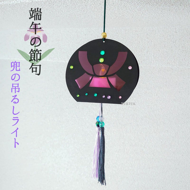 端午の節句をイメージした、兜の吊るしライトです。兜の抜きがあるぼんぼり部分にライトをセットします。下の部分にビーズと2本のタッセルを通せば兜の吊るしライトの完成です。
