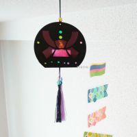 まず、兜が抜かれたシートを折り曲げて、ぼんぼり部分を作ります。兜の抜き型部分にセロファンを貼り付て、キラキラシールで飾ります。ぼんぼりの下の部分には2本のタッセルとビーズを付けます。兜のライトの完成です。