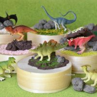 恐竜フィギュアは、ティラノサウルス・カルノタウルス・ギガノトサウルス・ブラキオサウルス・プテラノドン・スピノサウルス・パラサウロロフス・ステゴサウルスの8体。ジオラマ用の粘土と砂利、ジオラマスポンジ(7色)をセットにしました。曲げわっぱに、小さな恐竜の世界を作りましょう。