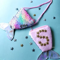 スパンコールがキラキラ輝く人魚のポシェット。それに星パーツで、自分のイニシャルを貼り付けたら完成ー!というなんともお手軽なキットです。身につけるだけでマーメイドの夏気分を味わえると思いますよ。