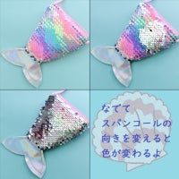 人魚ポシェットの色や柄は数種類あり、アソートです。スパンコール部分は、なでてスパンコールの向きを変えると色が変わります。柄によって、変わるスパンコールの色が違います。