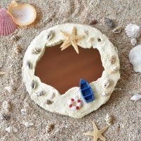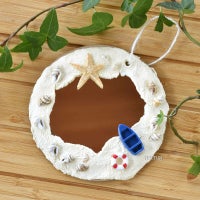 イベント前に、粘土を人数分に切り分けます。ミラーの裏面にボンドを塗って、ベースに貼ります。粘土をよくこねてやわらかくして、ベースに押し広げるように貼ります。ボートとうきわ、スターフィッシュと貝殻をボンドで貼れば、完成!お好みのひもやリボンを通して使ってください。