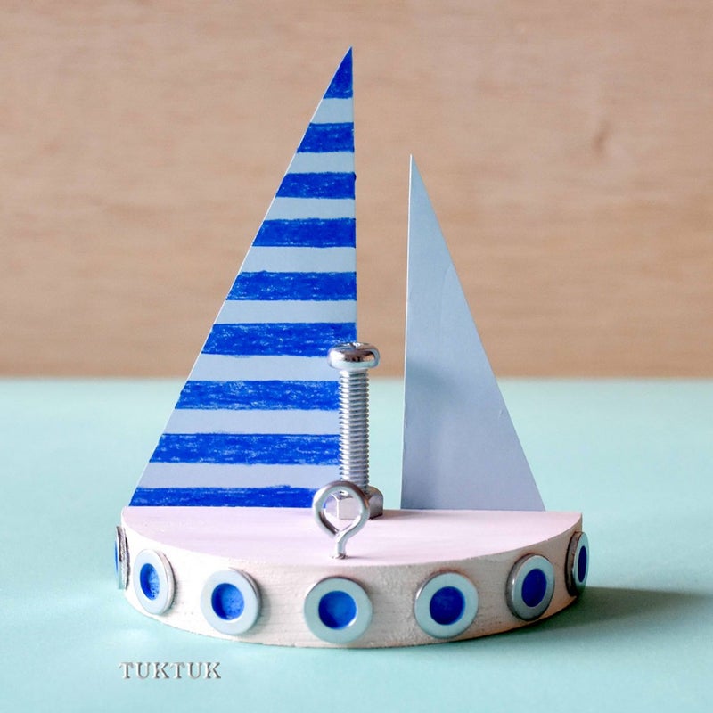 まず土台の板を塗りってから、ワッシャーを好きな場所に貼ります。1人7個セットになっているので、お好みで使ってくださいね。土台にヒートンをねじこみます。子どもの力では難しいので大人がしてあげてください(イベントの際には、事前にキリで少し穴をあけておくと、差し込みやすいかもしれません)。ボルトをナットに入れ、たっぷりとボンドを付けて、土台に貼ります。画用紙を切って色や模様を付けて、帆を作り、土台の後ろ側にボンドで貼り付けます。そのまま、ボルトとナットのボンドがしっかり乾くまで置いておいたら完成です!