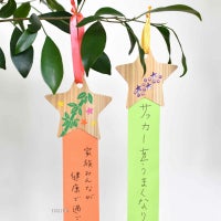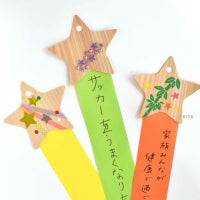 静岡県天竜産のヒノキの間伐材を利用して作った星のカードと短冊を組み合わせた七夕飾り。