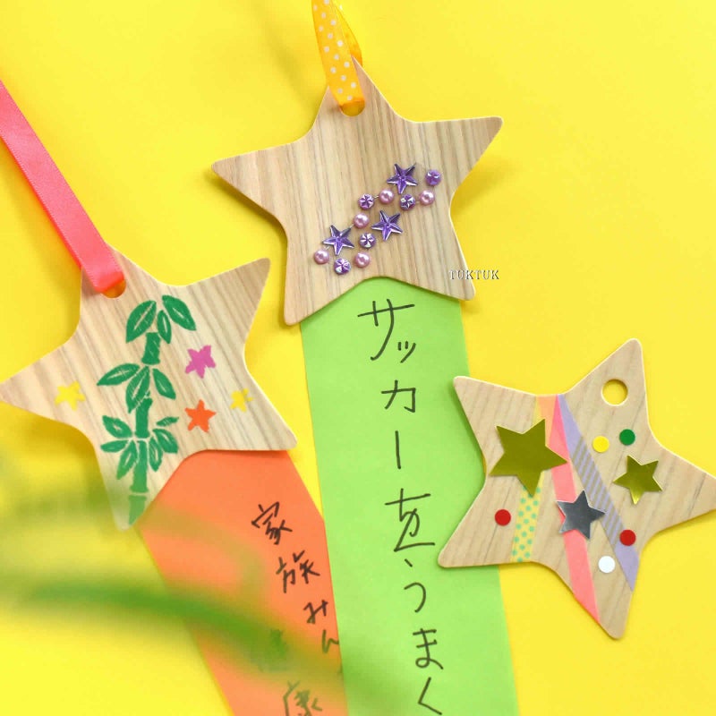 天の川のようなキラキラの星が並んだシールをセットにしました。細めのマスキングテープやシールを貼ってもかわいいです。お好みで、飾り付けの材料をご準備ください。七夕が終われば、短冊を外して、オーナメントとしてもお使いいただけます。