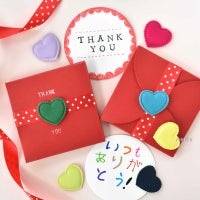 真っ赤なスクエアボックス、丸いメッセージカード、ハートモチーフ、丸シール、リボンと、材料はとってもシンプル。シンプルゆえに、アレンジを自由自在に楽しめます!