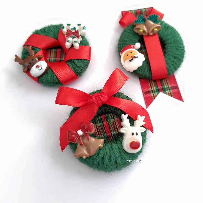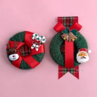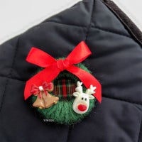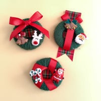 MDFのリースベースに毛糸を巻きつけて、クリスマスモチーフを貼り付ける簡単な工作です!赤のリボンやチェックのリボンをアクセントにクリスマスモチーフを貼り付けて、ブローチピンを付ければ完成です。リボンで雰囲気が変わるのがポイントです。バッグなどにつけてクリスマスの気分を楽しんでください。