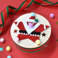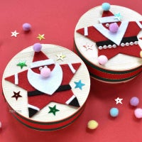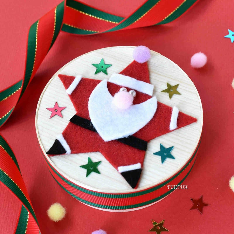 リボンに両面テープを貼って、わっぱのふたの側面に貼ります。白と黒のフェルトを自由に切って、ひげや帽子、ベルトなどを作ったり、ポンポンやラインストーンシールを貼ったりして、星型フェルトをサンタに変身させます。サンタをわっぱに貼って、スパンコールで飾り付ければ、完成!