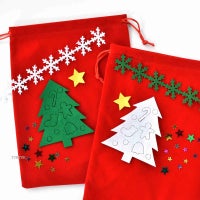 まず、結晶リボンをボンドできんちゃくに貼ります。つまようじがあるとボンドが塗りやすいですよ。フェルトツリーの飾りをはさみで切ってはずします(ひとつの飾りに1~2ヵ所つながっている部分があります)。星と一緒にボンドで貼ります。スパンコールで飾り付ければ、完成!