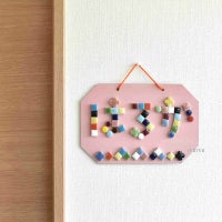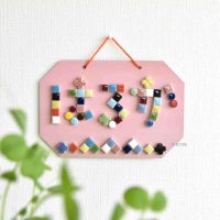 定番の1cm角の四角のタイルに加え、小さな丸いタイルとお花のタイルの3種類をセットにしました。四角のタイルだけでは表現しにくかった文字のカーブや、ちょっとしたアクセントにも使えるので、いろんなデザインのルームプレートが作っていただけます。
