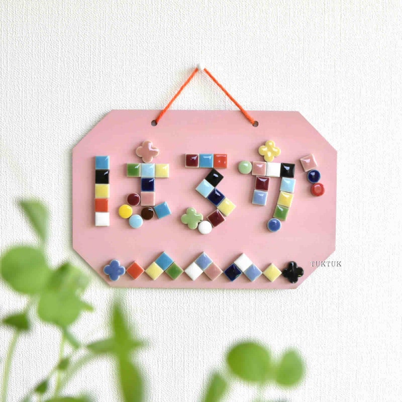 いろいろな形のモザイクタイルを組み合わせて文字を作るのが楽しい、ルームプレートのキット。